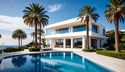 Modern white villa with infinity pool, overlooking ocean