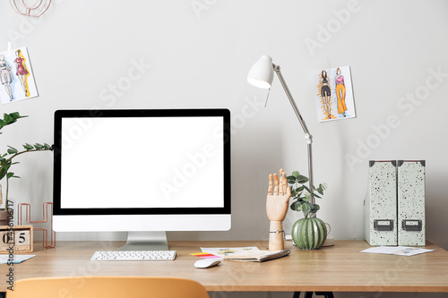 Modern workplace with computer near light wall