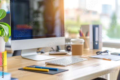 Modern Workspace with Job Posting on Computer Screen and Minimalist Office Supplies