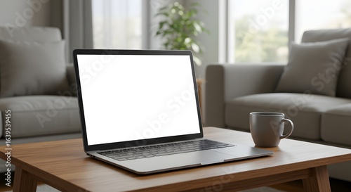 Modern workspace with laptop and coffee mug—cozy living room setting, soft natural light, and relaxed remote work atmosphere