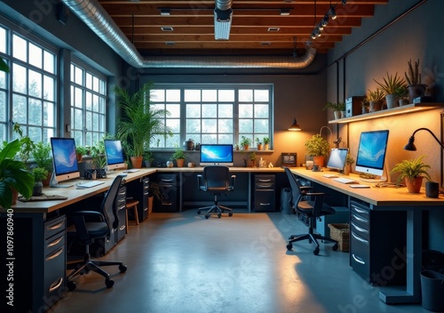 Modern workspace with multiple computer stations and plants.