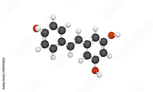 Molecular structure of resveratrol - antioxidant and potential chemopreventive activities. C14H12O3. Chemical structure model: Ball and Stick. 3D illustration. Isolated on white background.
