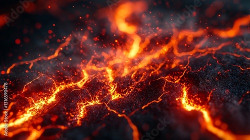 "Molten Majesty: A Close-Up of Glowing Lava Flow Amidst Stark, Darkened Volcanic Surroundings"