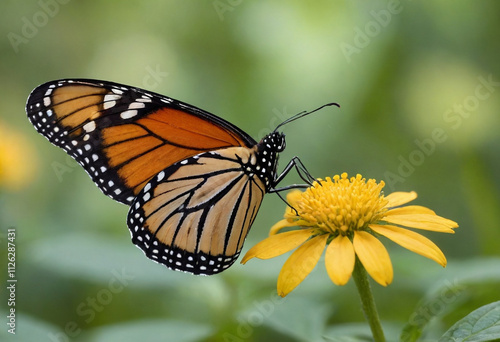 Monarch butterfly, vibrant orange wings, black veins, white spots, yellow flowers, green leaves, soft focus background, macro photography, detailed wings, nature close-up, delicate insect, pollinator,