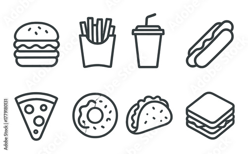 Monochrome fast food icons: burger, fries, drink, hot dog, pizza, donut, taco, sandwich