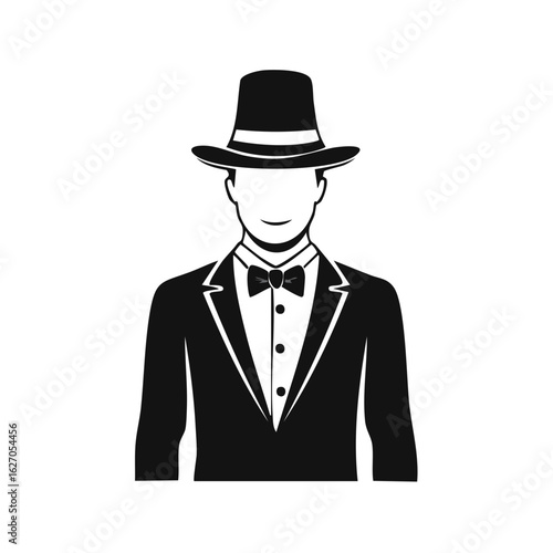 Monochrome icon of a man wearing a tuxedo, bow tie and hat in flat design style