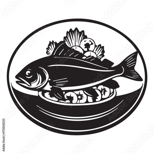 Monochrome illustration isolated on white background of a fish dish, featuring a whole fish served on a platter with garnish, creating an elegant and classic culinary image