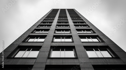 Monochrome low-angle view of a towering modern building's dark facade and many windows