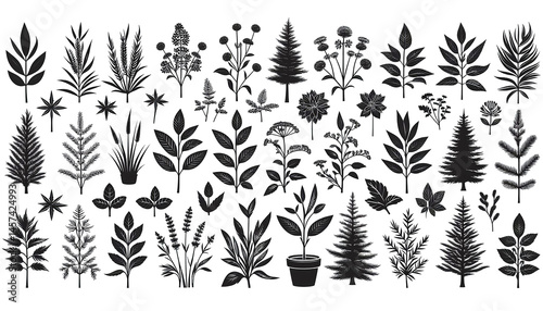 Monochrome Ultra Sharp Tree and Herb Vectors – Transparent PNG