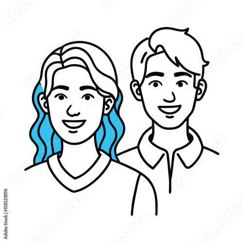 Monoline portrait of two non binary friends smiling and holding hands vector line art on white background