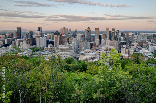 Montreal city skyline panorama at sunset viewed from Mont Royal with urban skyscrapers.
