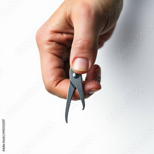 Moody Overhead Shot of Male Hand Holding Stainless Steel Nail Cutter – Minimalist White Background