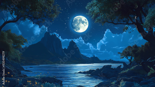 Moonlit island landscape at night. Nightfall. Illustration