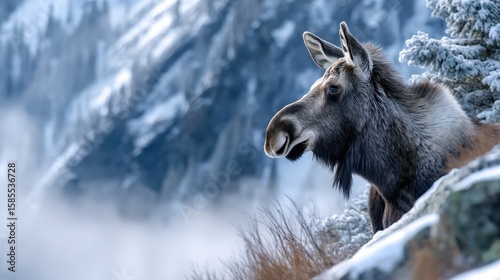 Moose gazes into the snowy wilderness among captivating mountain vistas
