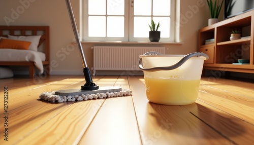Mop and bucket with soapy water on hardwood floor