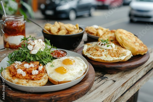 Morning break in a foodie city . Delicious brunch spread with eggs, potatoes, and fresh toppings.