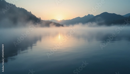 Morning Landscape with Fog over Lake and Mountain Peaks at Dawn