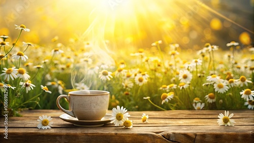 Morning serenity a steaming cup of tea on a rustic wooden surface amidst a field of blooming daisies bathed in sunlight.
