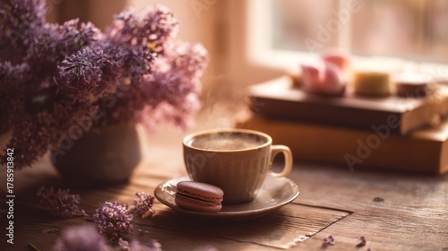 Morning Serenity with Coffee, Macaron, and Lilacs on a Wooden Table