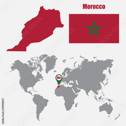 Morocco map on a world map with flag and map pointer. Vector illustration