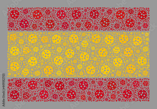 Mosaic Spain flag designed of Covid-2019 icons. Spain flag collage is made from random bacteria elements. Vector covid- 2019 collage rectangular Spain flag designed for inoculation illustrations.