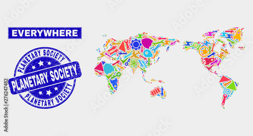 Mosaic technology world map and Planetary Society seal stamp. World map collage constructed with scattered colorful tools, hands, service icons.