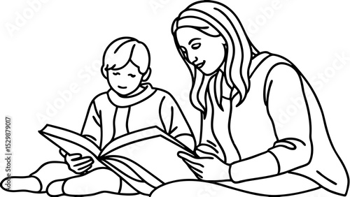 Mother and child reading together, line art illustration, educational bonding, literacy development