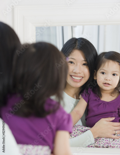 Mother and daughter looking in mirror
