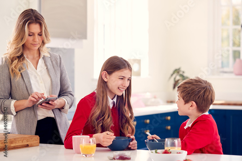 Mother Wearing Business Suit Having Breakfast With Children In School Uniform Before Work