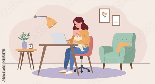Mother working from home with baby in cozy living room setting