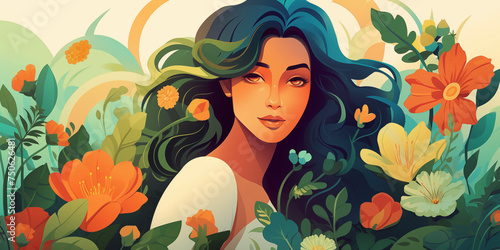 Mother's Day card. International Women's Day. Summertime, summer background. Girl in flowers field.