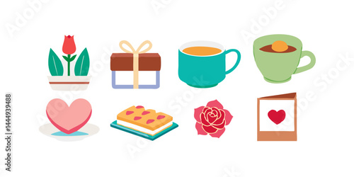 Mother's Day icon set featuring hearts, flowers, gift boxes, and family love symbols.