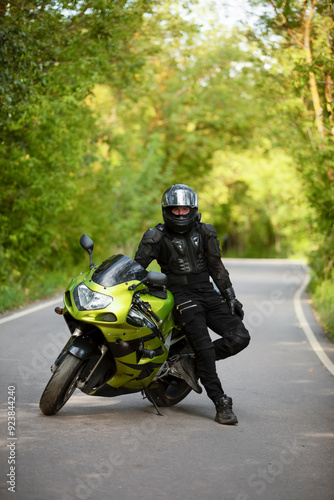 motorcyclist in black protective suit and helmet near green sports motorcycle
