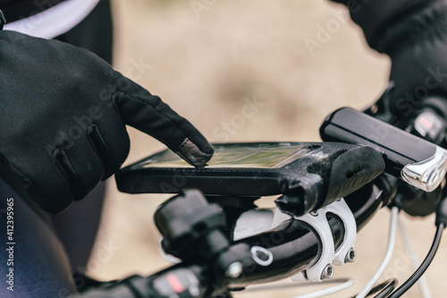 Mountain Bike Rider with Navigator looking for Something on Screen
