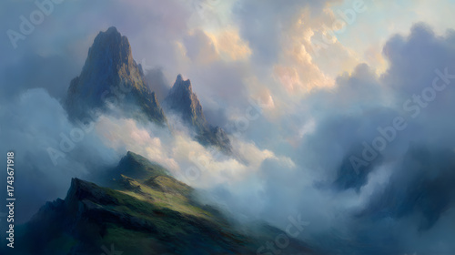 Mountain pass shrouded in soft clouds dreamy fantasy