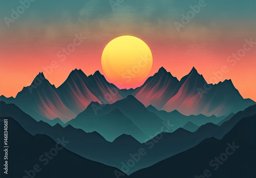 Mountain range with a large sun in the sky. The sun is setting and the sky is a mix of blue