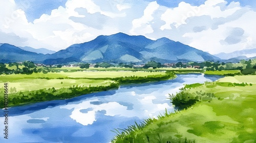 Mountain River Vista Green fields and reflections under a sky of scattered clouds