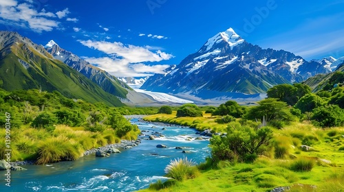Mountain River's Beauty: A breathtaking landscape of majestic snow-capped mountains and a winding river, with lush greenery embracing the scene under a bright blue sky.