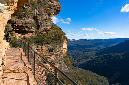 Mountain trail with steps over cliff edge. Wentworth Falls, Blue Mountains National Park, New South Wales, Australia