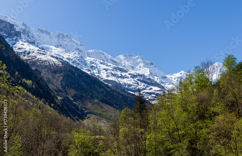 Mountains peaks and forest. Mountain range and clear blue sky. Swiss landscape in the summertime