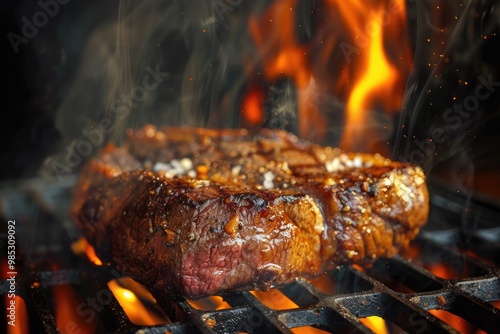 Mouth-watering steak cooking over high flames, smoky backdrop