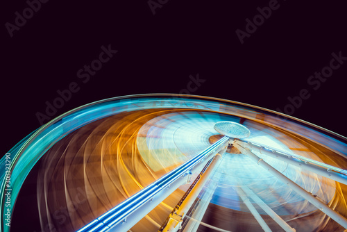 Moving and illuminated ferris wheel, big wheel on a dark background.