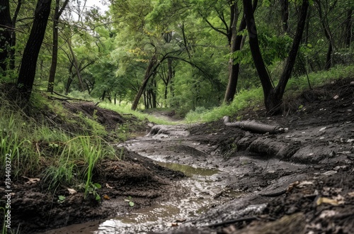 Muddy Trail in Lush Green Forest After Rain