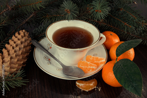 Mug of tea with tangerines and Christmas tree branches. Dark background.