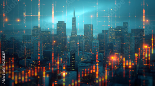 Multi exposure of abstract virtual financial graph hologram on San Francisco skyline background, forex and investment concept. double exposure of wireframe city interface.