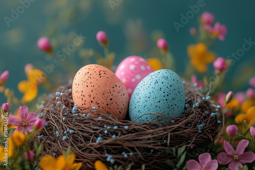 Multicolored Dyed Easter Eggs. Multicolored, dyed Easter eggs in a nest and wicker basket