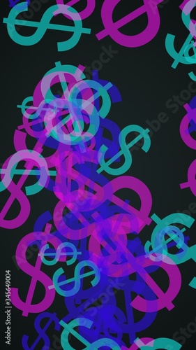 Multicolored translucent dollar signs on dark background. Red tones. 3D illustration
