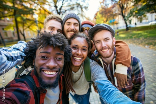Multicultural young people enjoying taking group selfies on street - Multiracial young people celebrating outdoors - Happy lifestyle concept.