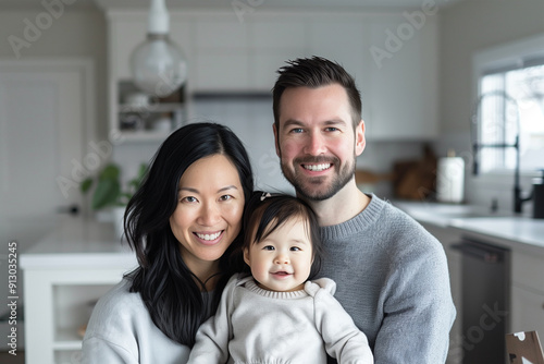 multiethnic couple, an Asian mother and a Caucasian father holding their baby girl in their living room, smiling and looking at the camera.