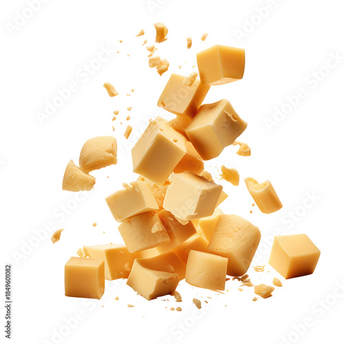 Multiple cheddar and mozzarella cubes captured mid fall on transparent background